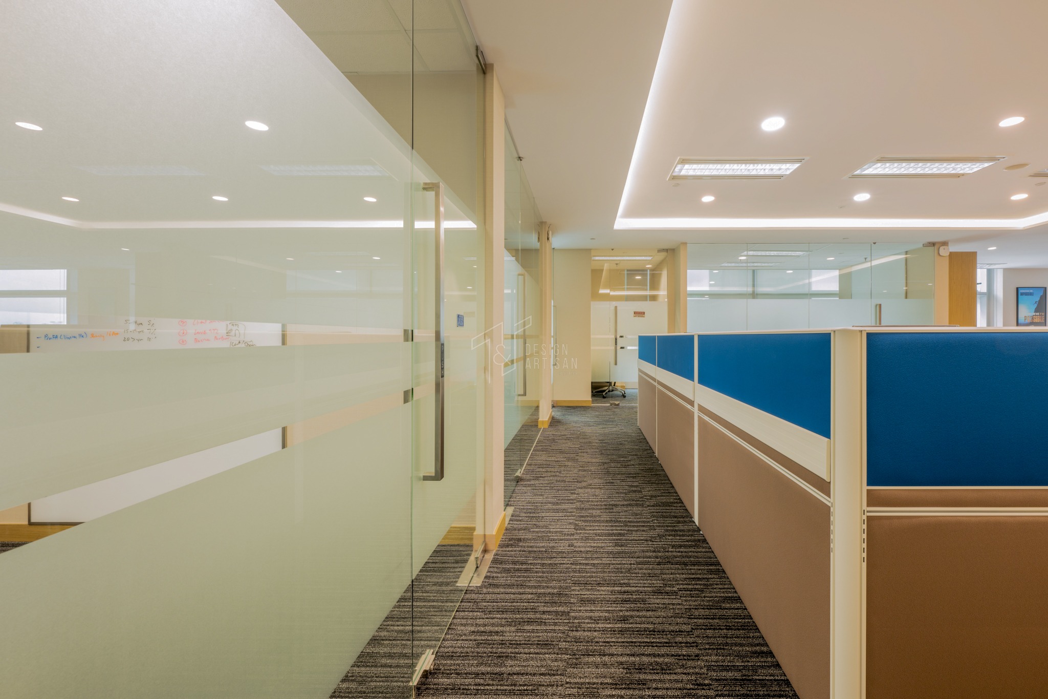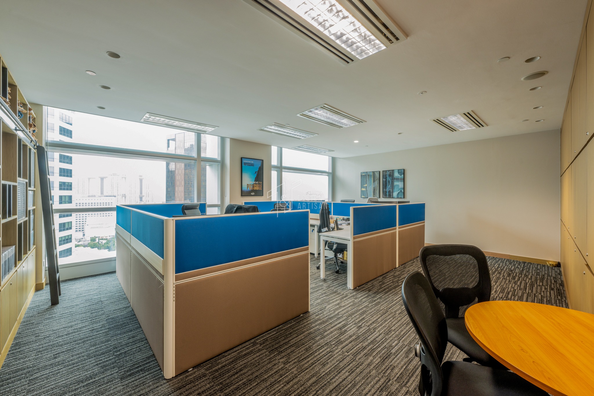 This office interior showcases a sleek and contemporary design that emphasizes functionality, comfort, and collaboration. The open-concept layout is thoughtfully organized with modular workstations featuring clean lines and vibrant blue panels that bring a refreshing pop of color to the space. These cubicles offer both privacy and openness, allowing for focused work while encouraging team interaction.