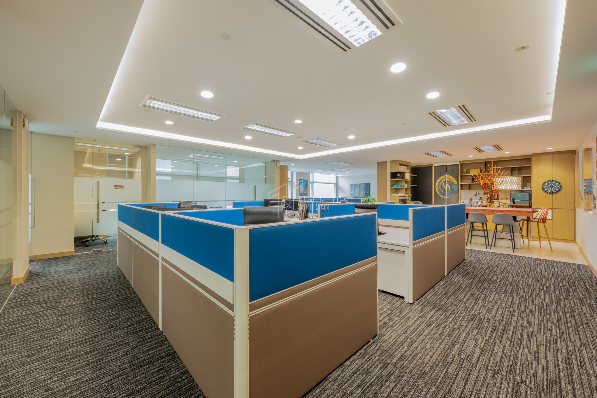 A cozy pantry and breakout area are strategically placed within the office to promote relaxation and informal discussions. Warm wooden textures, decorative accents, and greenery add a touch of homeliness, blending seamlessly with the modern corporate aesthetic.