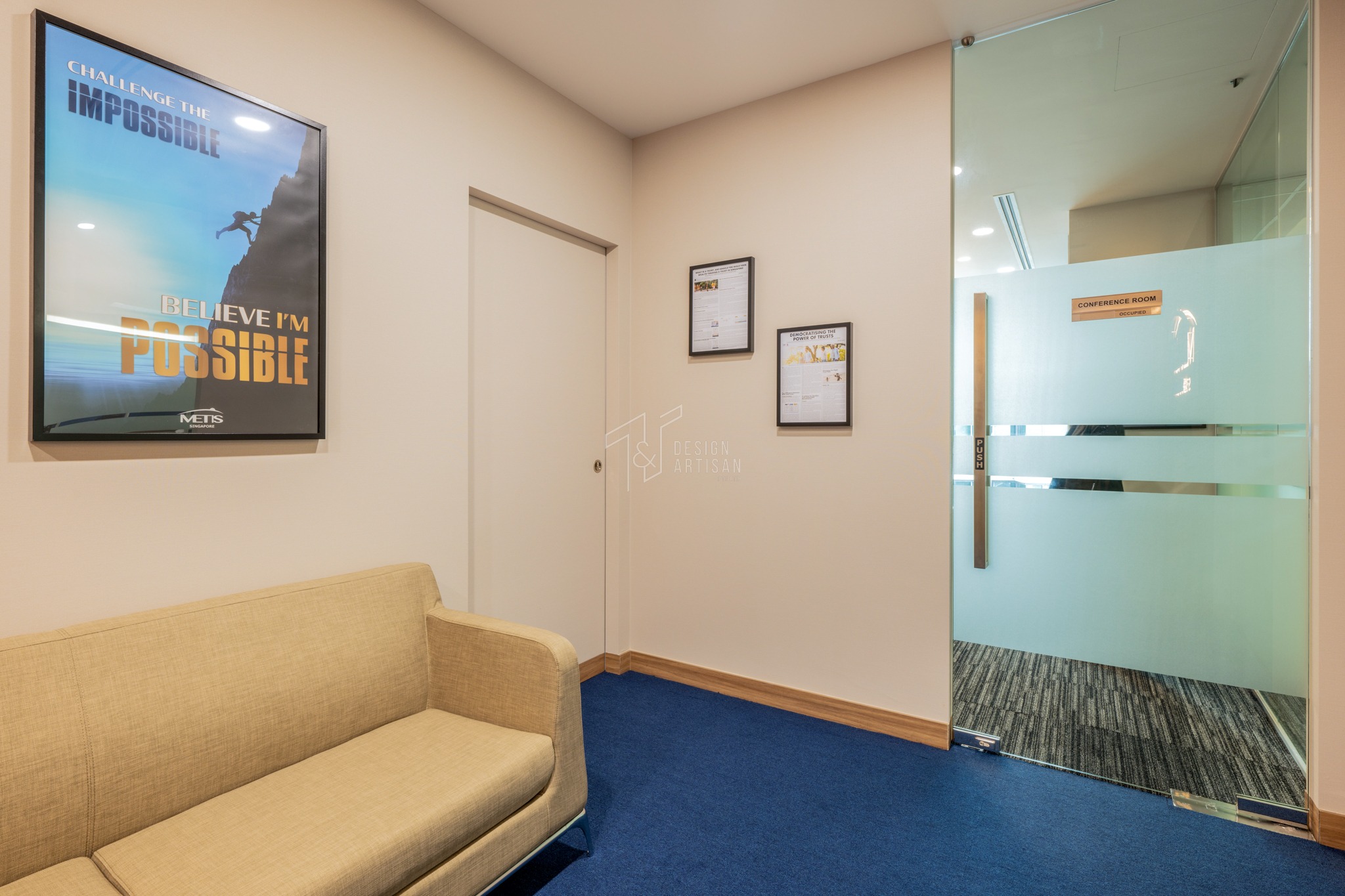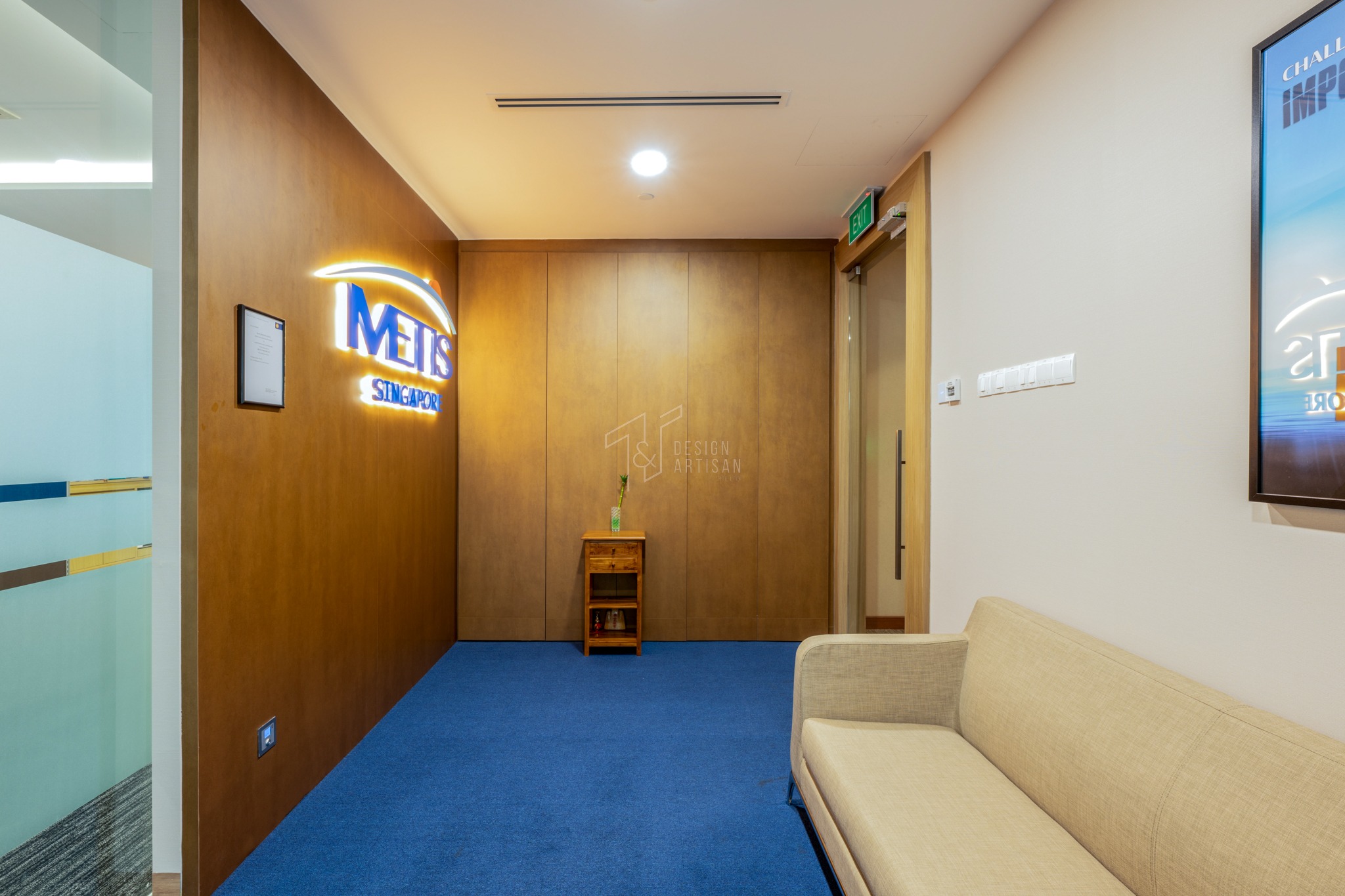 Soft, neutral tones on the flooring and walls balance the bold accents, creating a professional yet inviting atmosphere. The ceiling lighting, enhanced by recessed and cove illumination, provides even brightness throughout, contributing to a productive and visually comfortable environment.