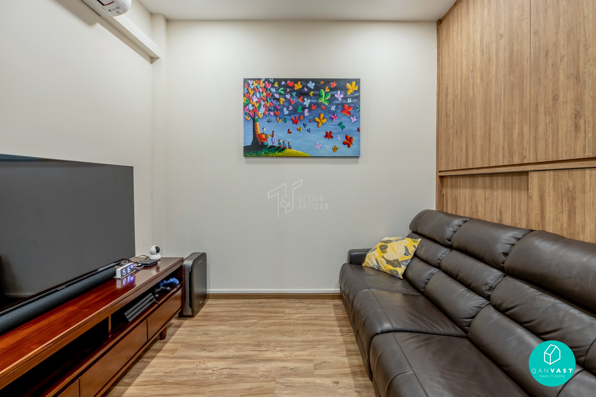 The high ceilings and clean architectural lines add to the airy, expansive feel, while subtle textures and warm wood accents introduce a touch of natural comfort. The statement feature wall behind the television, paired with mirrored panels, creates both depth and visual balance, elevating the modern aesthetic.